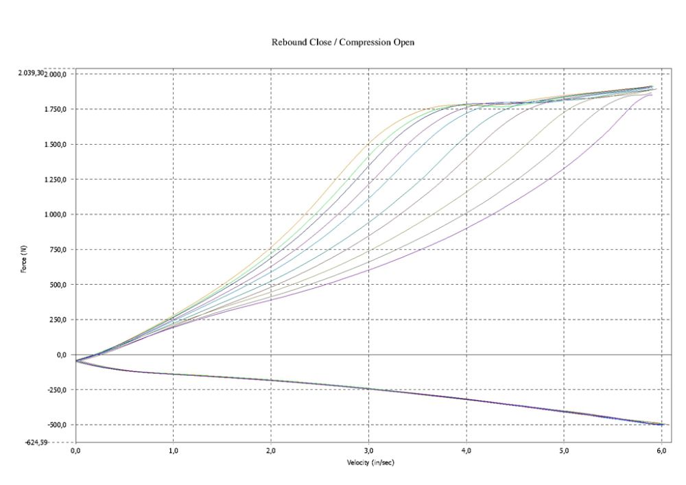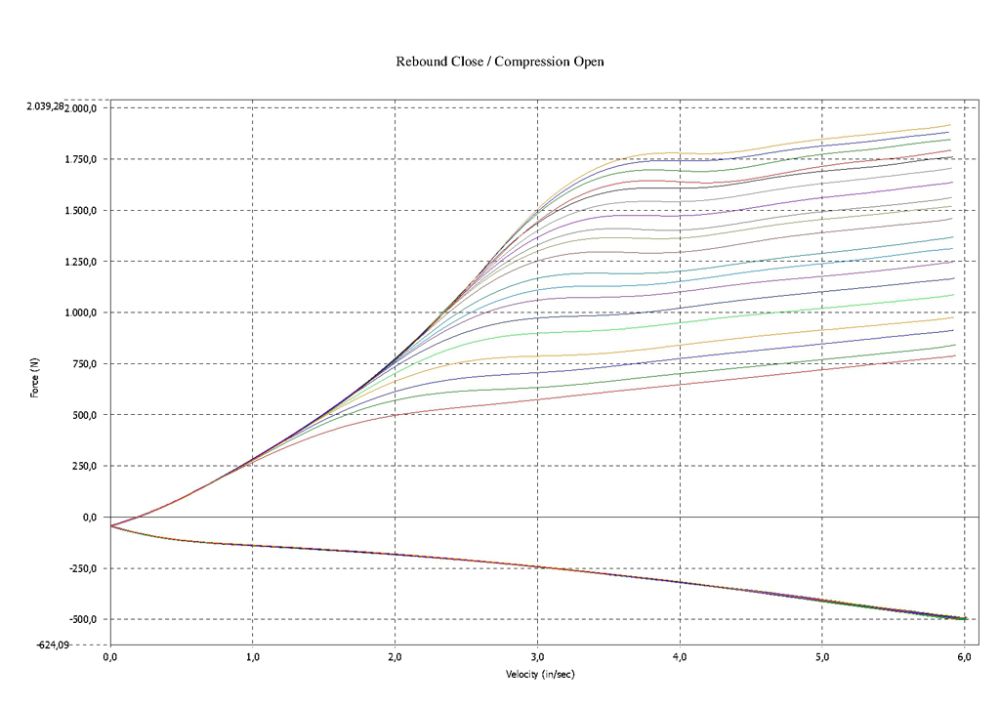 No need to compromise on performance/comfort due to the large adjustment range. The suspension allows adjustment between smooth street use and aggressive track use. Below you can see the force / displacement graph of a typical JRZ RS PRO.