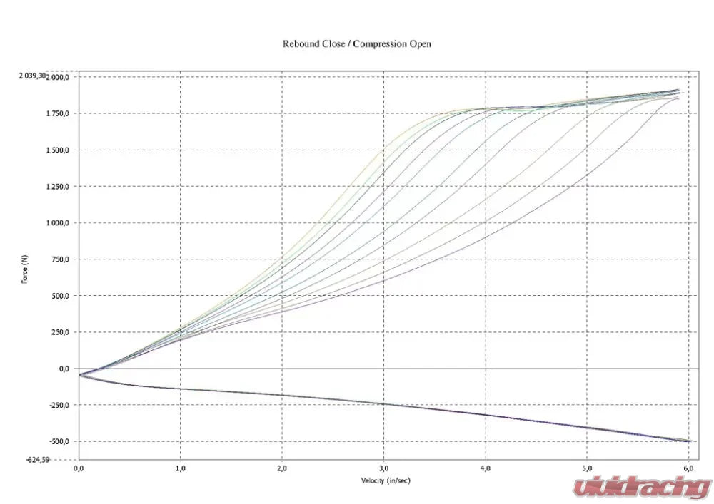 No need to compromise on performance/comfort due to the large adjustment range. The suspension allows adjustment between smooth street use and aggressive track use. Below you can see the force / displacement graph of a typical JRZ RS PRO.