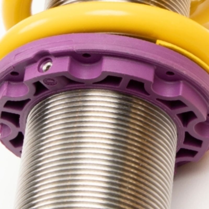 KW's coilover suspension struts are manufactured from high-quality stainless steel that is rust-proof. In contrast to other solutions, Inox-Line coatings will not wear off while adjusting the suspension making KW coilover struts 100 percent corrosion resistant with an unlimited lifespan. Lowering the suspension using the trapezoidal thread in combination with the polyamide composite spring seat guarantees long term usability. Even after years the ride height adjustability is not affected.