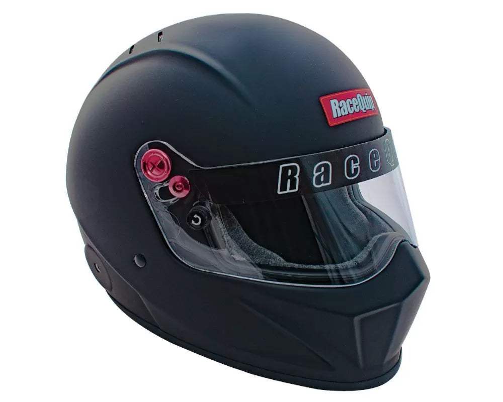 RaceQuip's VESTA20 full face Snell SA2020 rated helmet is a bold departure from traditional auto racing helmet styling. The VESTA20 incorporates contemporary design with modern production techniques. The shell is built using composite materials placed into pressurized steel molds to achieve the best combination of light weight and strength. This innovative new helmet model features FRP Composite shell construction and a uniquely shaped chin bar to support a scalloped face shield design. Reinforced M6 threaded HANS/HNR inserts are mated to the shell along with an expanded polystyrene (EPS) liner. HANS or other Head and Neck Restraint device anchor posts (not included) can be easily attached to the outside of the helmet using the installed M6 threaded inserts. The distortion free 3mm polycarbonate face shield features a molded thumb catch, red anodized aluminum pivot kit, hand ratcheting Tear Off posts, and a silicone eye port gasket to seal out dust and dirt. A wide eye port provides good peripheral vision and allows the use of personal eyewear. Included with the helmet are an extra set of thicker cheek pads to allow a customized fit. The Snell SA rating means that the interior, paint, and Kevlar chin strap are all fire-retardant.
