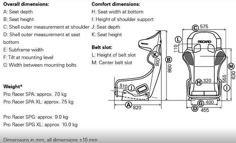 Features:Suitable for 4-, 5- or 6-point belts (competition-grade)Flame-retardant upholsteryFriction grip surface around the shouldersFlexible sidemount (fore-aft adjustment for preferred sitting positions)Paddable lumbar supportSeat shell:SPA models: Carbon-aramid Composite (CFRP/AFRP, also known as Kevlar-Carbon Fiber Composite)SPG models: Glass fiber reinforced polymer (GFRP)FIA approval for 5 yearsHighly flame-retardant upholstery (FMVSS 302)Shock-absorbent foamSuitable for HANS systemsXL Version:larger belt slotsseat shell 35 mm wider and 50 mm higherDesigned for:GT vehiclesSports carsTouring vehiclesRally vehiclesAccessories:Steel sidemountAluminum sidemountFlexible sidemount ideal for races with change of driverSeat cushionBolster Material: Velour BlackInsert Material: Velour BlackLogo Color: WhiteAccessories:Steel sidemountAluminum sidemountFlexible sidemount ideal for races with change of driverSeat cushionNotes:FIA approval 8855-1999 only valid in conjunction with the specified RECARO sidemount.
