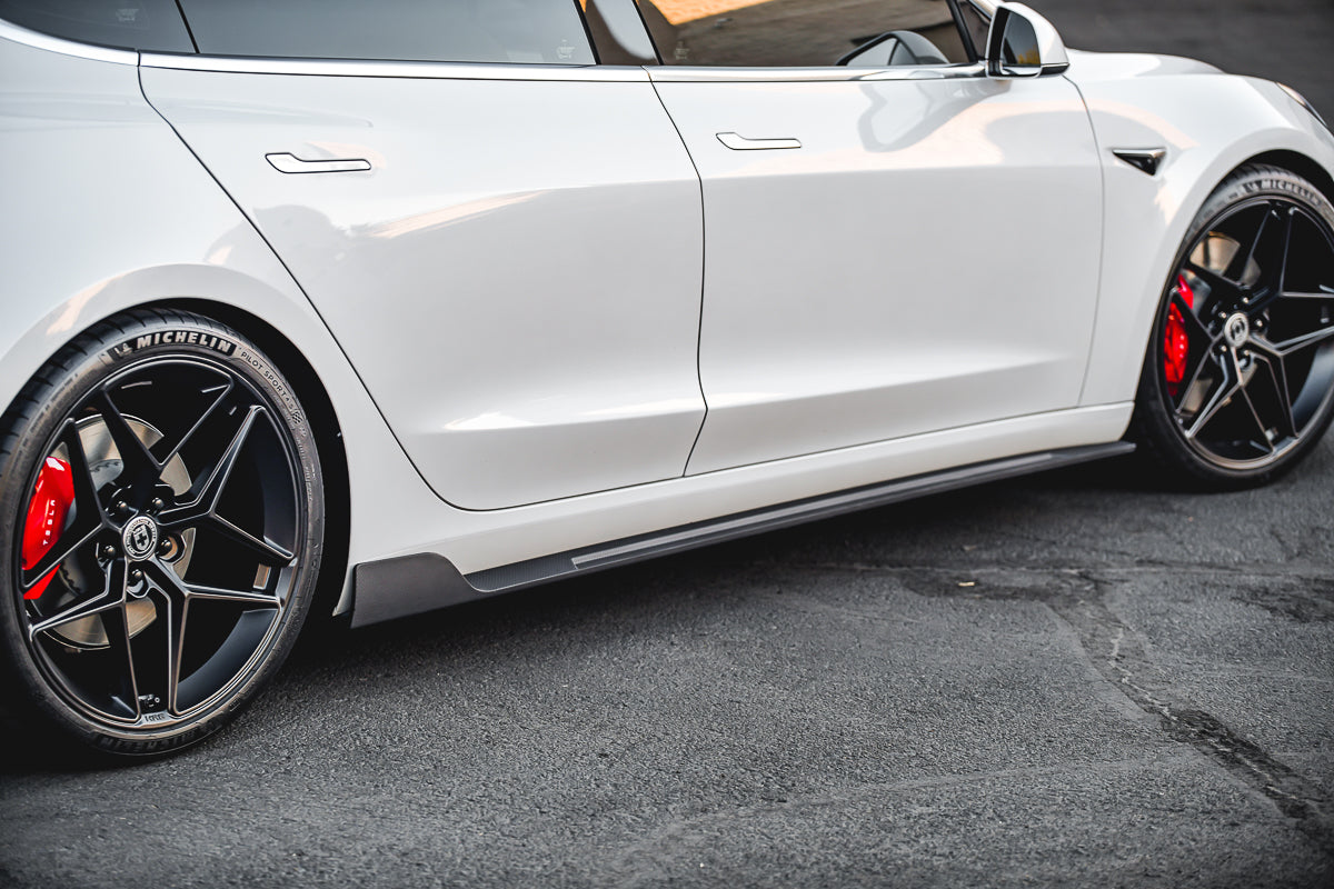 Bring your Tesla Model 3 to life with the VR Aero carbon fiber side skirts by Vivid Racing. Side skirts are a great way to tie your entire look together, especially if you opt for complementary pieces like a front lip spoiler and rear diffuser. Even when installed alone, side skirts give your vehicle a more aggressive and lower appearance with a stance that demands attention. They hang 0.5 inches lower than the factory rocker panels and appear to stick out just the right amount to give it that sporty car look.